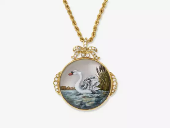 Лот 68 | A pendant with a swan and diamonds, and a cord necklace