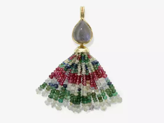 Лот 93 | A pendant with moonstone with tassel, consisting of seventeen strands of rubies, sapphires, white sapphires, and emeralds