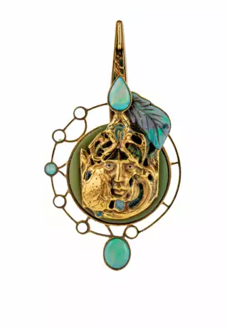 Octave Landuyt, pendant in display case with the book ''Aurum Flandriae'', personal dedication and signature of the artist in the book, pendant signed, 750 yellow gold, tested, green patina, 6 cabochon-cut opals, 1 opal cut as a drop and one opal cut as a leaf, one nephrite plate with a diameter of 4.5 cm, dimensions approx. 10.4 cm x 5.6 cm, total weight of the pendant approx. 49.8 g, book cover partially scratched, creased and rubbed, one corner of the display case veneer has come loose, partially scratched and rubbed, pendant with signs of wear in the form of scratches and rubbing