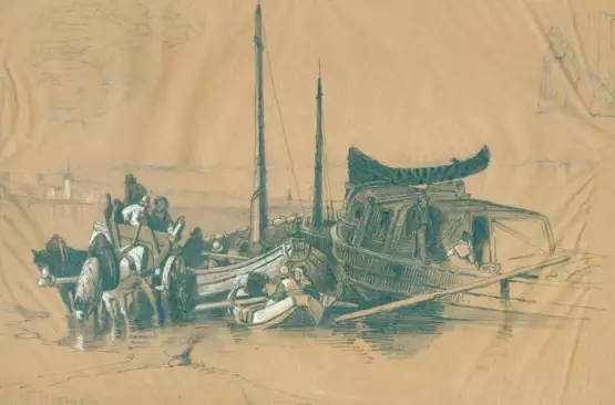Dabei: Bossuet, François Antoine (1798 Ypern - Saint-Josse-ten-Noode 1889). Löschen der Schiffsladung. Weiß gehöhte Bleistift- u. Tuschezeichung. In den oberen Ecken je Bleistiftskizzen. 16 x 23,5 cm. Li. unten sign. ╔Dabei:Morland, George╗ (1763 London - Brighton 1804), nach. The Corn Bin. Mezzotinto v. I.R.Smith, London 1799. 43 x 55 cm. - Auf weißem Rand fl.