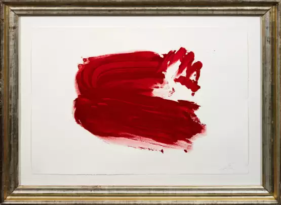 Farblithographie in Rot/Rives-Velin (Wasserzeichen), 1973. Sign. und bez. H.C. (Künstlerexpl.). Blatt IV aus der gleichnamigen Folge, erschienen außerhalb der Auflage von 75 nummerierten Exemplaren bei Poligrafa, Barcelona. Wvz. Galfetti 355. Blatt 45 cm 62 cm. Rahmen.