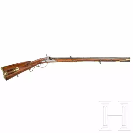Oktagonaler, mittig leicht eingezogener Lauf mit achtfach gezogener Seele im Kaliber 13 mm. Eingeschobene Klappkimme und Silberkorn, Schwanzschraubenblatt aus Messing. Aptiertes Perkussionsschloss mit deutschem Stecher. Gewölbte Schlossplatte mit Signatur "Andreas Hauer - in Wirzburg". Fein floral verschnittene Walnuss-Vollschäftung mit Messinggarnitur und Kolbenfach. Hölzerner Ladestock mit hornummanteltem Dopper und gegenseitigem Kugelzieher mit Gewinde. Länge 106 cm.
