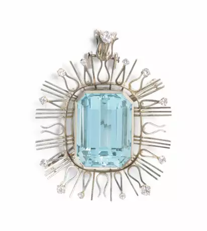 1970er Jahre. 750 Weissgold. Mittig ein oktagonaler Aquamarin mit Treppenschliff von ca. 50 ct. Gebogene und strahlenartig arrangierte Stiftelemente halten zahlreiche Brillanten, von zus. ca. 0.50 ct, abnehmbare Anhängeröse mit Brillanten von ca. 0.20 ct. L 6x4 cm, 39 g.