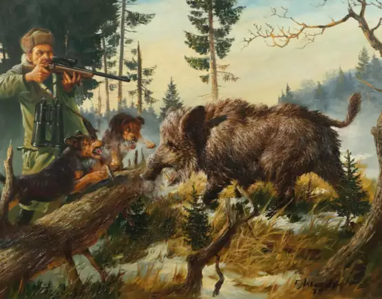 Лот 2286 | Arendt, Fred 1928 - 2014, deutscher Maler. ''Wildschweinjagd'', winter…