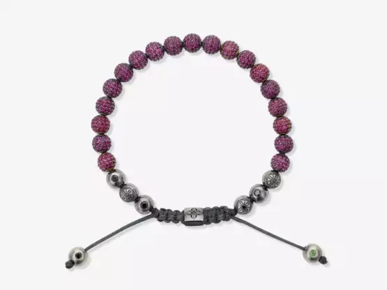 Blackened gold 750/-, hallmarked and assayed. Jeweller's mark SJ. 15 black diamonds. Approx. 1118 tiny round facet-cut rubies in 19 beads, 1 green-coloured stone. Black braided bracelet. A few stones missing. Length approx. 21 cm (adjustable). Ca. 28.3 g.