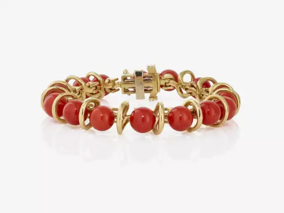 Yellow gold 750/-, hallmarked. Jeweller's mark RB. 16 coral beads. The bracelet is in very good condition, showing only minor signs of wear and tear consistent with its age. Length approx. 16.5 cm. Ca. 47.1 g.