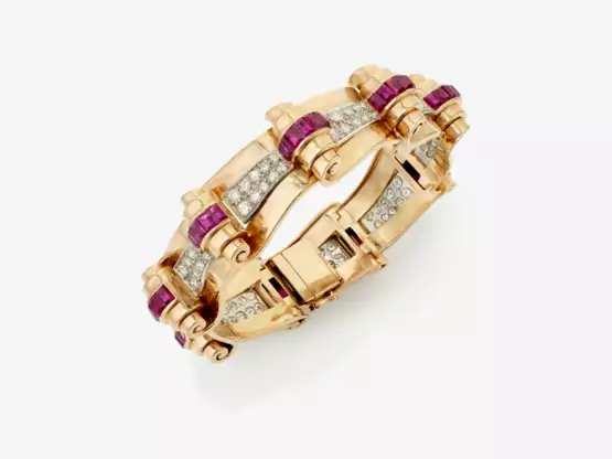 Armband mit Rubinen und Diamanten. WALSER WALD, 1940er Jahre. Gelbgold 750/-.