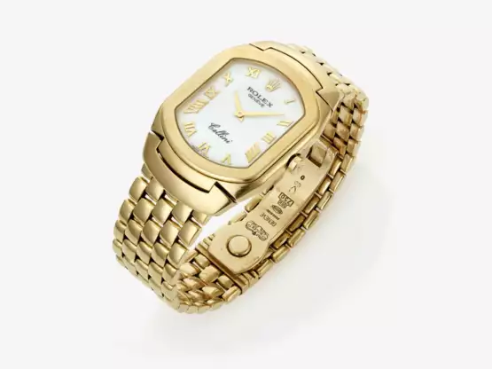 Weißes Zifferblatt mit goldenen römischen Ziffern, bezeichnet ROLEX Genève Cellini Swiss Made. Lünette bezeichnet innen Montres Rolex S.A., Geneva, Switzerland, Feingehaltspunzen, Nr. 6633, 11 1275. Originales Gold-Gliederarmband.