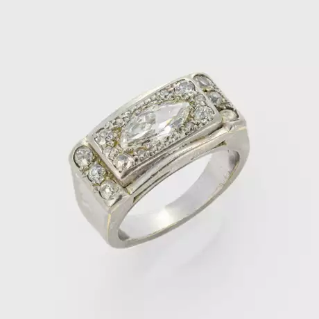 Platin, gest. 750. Zentral besetzt mit einer Diamant-Navette von ca. 1,00 ct (I-J/i2), ausgefasst mit Diamantrosen. Gew. ca. 5,31 g.