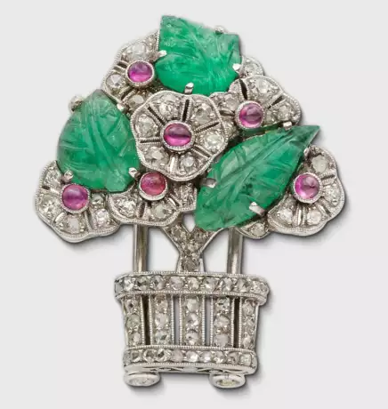 Weißgold, 18 k. Plastische Darstellung eines blühenden Baumes in Ajour, schauseitig ausgefasst mit Diamantrosen, kleinen Rubin-Cabochons und als Blatt geschnittene Smaragde. Gew. ca. 9,30 g.