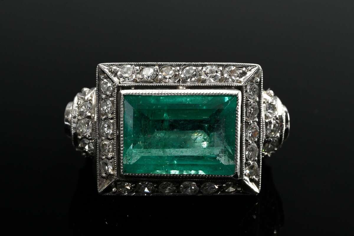 Лот 224 | Art Deco Weißgold 585 Ring mit Smaragd im Treppenschliff (ca. 2.6ct) und Achtkantdiamanten (zus. ca. 0.60ct/VSI/W) in eckiger Fassung, 5,1g, Gr. 54