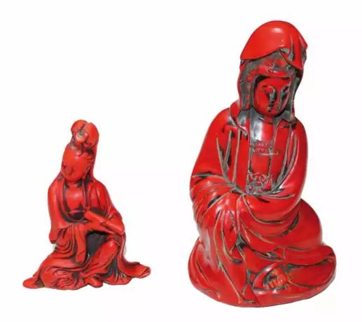 2 Guanyinfiguren in Korallenoptik, Dose mit Essstäbchen Holz, emaillierter Teller mit reichem Blüten und Landschaftsdekor, D: 25 cm. (Beschädigt). - Zus. 4 Teile.