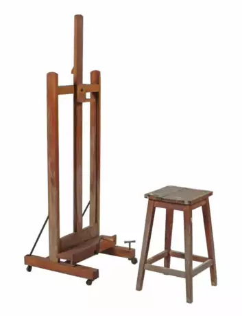 Лот 505 | Atelier-Staffelei mit Hocker 20. Jh., Staffeleigestell aus Buche mit M…