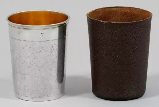 Silber. Sich gering konisch erweiternder Korpus mit glatten, profilgerahmten Rändern. Wandungsmitte umzogen von sog. Schlangenhautdekor. Am Boden graviertes Wappen mit Bischofshut, Initialen "PA" und Dat. "1655". Innen vergoldet. Mit Lederfutteral. Minim. best.; Gest., Tremolierstrich, Stadtmarke, Johann I. Seutter (wird Meister 1639). Gew. ca. 125 g. H. 8,5 cm.