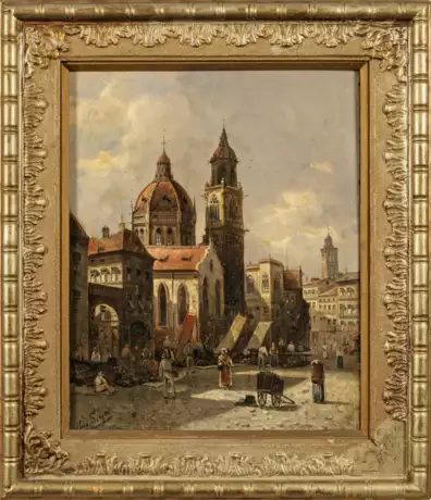 Blick auf einen belebten Kirchplatz mit Stadthäusern, gotischer Kirchenfassade und Marktständen, dahinter erheben sich etwas kapriziös eine runde Barockkuppel und dicht daneben ein gotischer Rathausturm sowie etwas entfernt, ein weiterer Campanile mit Laterne als oberem Abschluss. Der österreichische Maler verwendete hier ein Verwirrspiel scheinbar historischer Gebäude mit einem Wiedererkennungseffekt. Vermutlich nach dem Vorbild des italienischen Capriccio-Künstlers Giovanni Battista Pannini, der zahlreiche versatzstückartig kombinierte Romansichten schuf. Die Malerei Siegens zeichnet sich durch einen altmeisterlichen Malduktus, Detailliertheit und eine gekonnte Lichtregie aus. Öl/Holz. L. u. sign.; 53 cm x 42 cm. Rahmen.