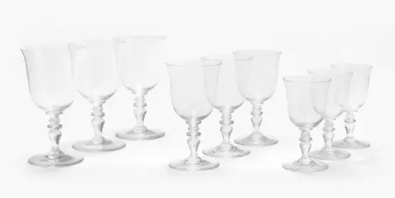 20.Jh. Farbloses Kristallglas. Bestand: 12 Rotweingläser (H 16 cm), 9 Weissweingläser (H 14,5 cm), 12 Süssweingläser (H 15 cm). Total 33 Teile.