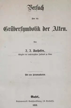 Ziegenfuß, S. 65. Erste Ausgabe. - Mit dieser Interpretation von Mythen und alten Symbolen ebnete Bachofen den Weg für Freud und Jung. - Schwach gebräunt, vereinzelt schwach fleckig, Anfang etw. gelockert.