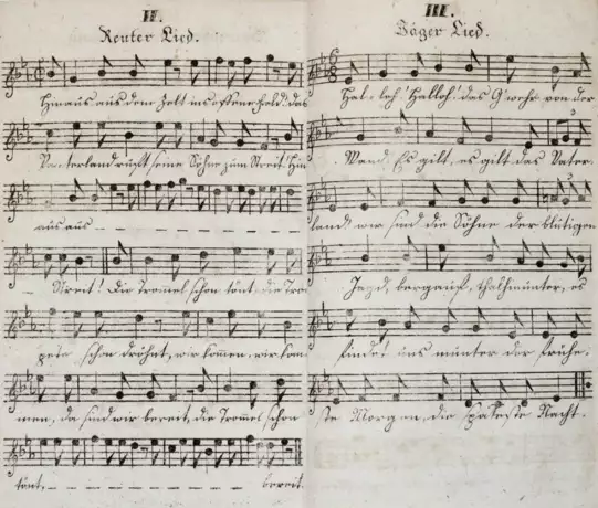 Inkunabel der Lithographie. Nicht in den einschlägigen Bibliographien. - "Diese vier Kriegslieder sind mit der dazu gehörigen vollständigen Musik an die churpfalzbairischen Armeecorps abgeschickt, und dort unentgeldlich vertheilt worden". Enthält: Bairischer Schlachtgesang, Reuter-Lied, Jäger-Lied, Zapfenstreich. - Vereinzelt kl. Randläs., Monogr.-St. auf le. Bl.
