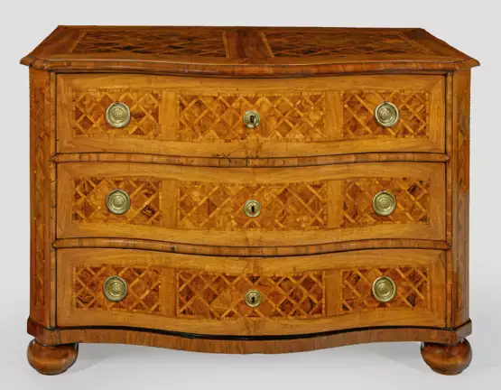 Nussbaum, furniert. Gerader, querrechteckig angelegter Korpus, flankiert von schräggestellten Ecklisenen auf flacher Zarge und gedrückten Füßen. In der gegliederten Front drei breite, geschweifte Schubladen. Korrespondierende, gering überstehende Deckplatte. Flächendeckend breit gerahmte Furnierfelder aus Gitterwerk, von Bandeinlagen begrenzt. H. 80 cm. 118 cm x 68 cm.
