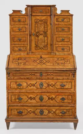 Nussbaum, furniert sowie Einlagen aus unterschiedlichen Edelhölzern. Gerader, querrechteckig angelegter Korpus auf profilierter Zarge und konischen Vierkantbeinen. In der gegliederten Front drei breite Schubladen sowie ausziehbare Stützen für schräggestellte, abklappbare Arbeitsfläche. Oberhalb mittig leicht eingezogener Aufsatz mit zentraler Tabernakeltür sowie diversen Schubfächern mit stilisierten Landschaftseinlagen. Gestuft ansteigender oberer Abschluss. Flächendeckend breit gerahmte Furnierfelder, schauseitig von kontrastierenden Bandeinlagen begrenzt. H. 190 cm. 112 cm x 58 cm.