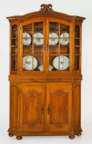 Kirschbaum, massiv. Gerader Korpus flankiert von breiten, schräggestellten Ecklisenen auf schmaler Profilzarge und gedrückten Kugelfüßen. In der gegliederten Front zwei Türen mit kassettierten Füllungen sowie zwei Schubfächer. Oberhalb korrespondierender, zweitürig sprossenverglaster Vitrinenaufsatz mit geschweift ansteigendem Profilgesims und Bekrönung aus geschnitzten, gegeneinander gestellten Voluten. H. 212 cm. 132 cm x 47 cm.