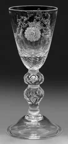 Farbloses Glas, geschliffen und geschnitten. Auf aufgewölbtem Fuß umgeschlagenem Fußrand Schaft mit zwei facettierten Nodi, darin je eine eingestochene Luftblase. Schlanke Kuppa am Ansatz mit Lanzettfries, auf der Wandung vorne und hinten zwei Aphorismen: "Denen sei der Mondt verdeckt in deren hertzen falscheit steckt / Denen soll die Sonne scheinen die es treulich mit uns meinen", begleitet jeweils von der Darstellung einer Sonne und eines von Wolken umgebenen Mondes. H. 23 cm.