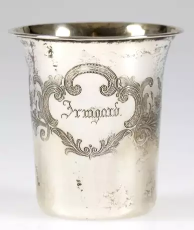 Лот 695 | Becher, 19. Jh, 12 Lot Silber, innen vergoldet, ausgestellter und umgeschlagener Rand, in blumenumrankter Kartusche Namensgravur "Irmgard", Gew. 37,5 g, H. 7 cm