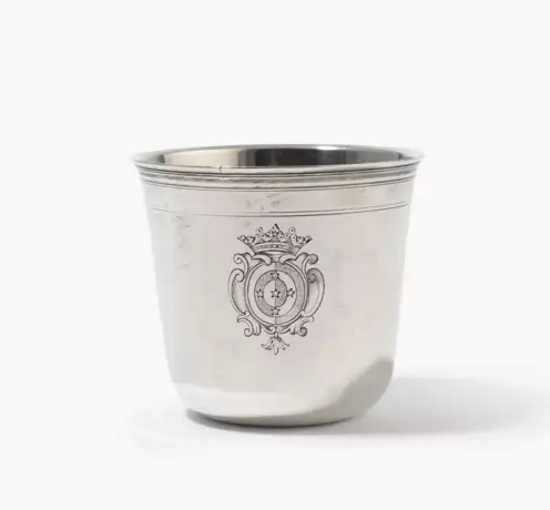 Silber. Beschaumeistermarke Julien Berthe. Blanke Zylinderform mit profiliertem Lippenrand, Wandung mit bekröntem Gravurdekor. Bodenunterseite: Pariser Beschaumeistermarke, Beizeichen. H 6 cm, ca. 76 g.