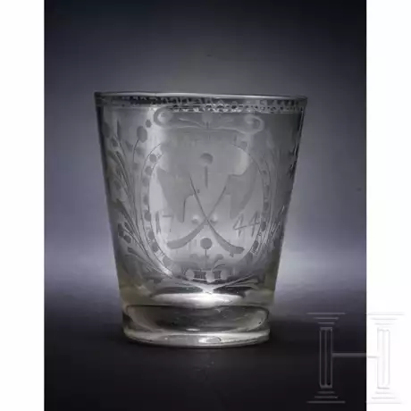 Farbloses Glas. Unterseite mit Abriss. Auf der Frontseite der konischen Kuppa geschnittenes Emblem der Metzgerzunft mit Datierung "1744". Rückseite mit Inschrift "ehrlich un wacker sind die ? Sie schlagen nieder rinder, un ? das dir ?". Höhe 9,9 cm.