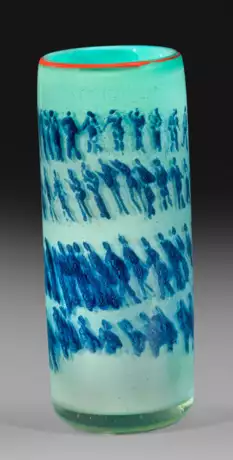 Farbloses Glas mit figuralen Einschmelzungen in horizontalen Linien als bewegte Menschenmenge in Dunkelblau. Wandung Lindgrün mit Abschluss in Rostrot. Ritz-Sign. und Dat. mit Nummerierung "2". H. 21,5 cm.