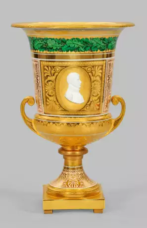 Derartige Kratervasen zeichnen sich durch das Herrscher-Portrait als königliche Geschenkgaben aus. Formgleiche Vedutenvasen mit Darstellungen preußischer Besitzungen sind im königlichen Journal als solche vermerkt. Die Vorlage der Vedute entstammt wohl einer Zeichnung von Friedrich August Calau bzw. einer graphischen Vorlage der Zeichnung.