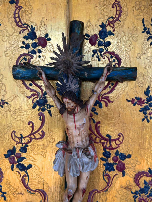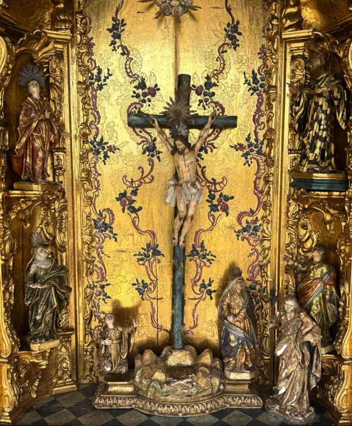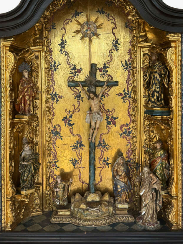 Important domestic altar, wood, externally ebonized, carved, gilded and polychrome painted, 149 × 108 (201 cm with doors open) × 33.5 cm (H, W, D), richly carved ornamentation, back panel with punched and painted decorations, central Crucifixion of Christ with three attendant figures, flanked by Mary, Joseph with the Christ Child, and additional male and female saints set in gilded relief niches, a total of eight figures (partly worn), on the two shaped wings two painted scenes each depicting the Passion of Christ (each 134 × 50 cm), interior with floral punched gilded background, shaped cornice, age-related cracks and losses, completeness uncertain, Brazil, 18th century, provenance: Allgäuer Auktionshaus, Kempten (2013), accompanied by invoice and written provenance statement