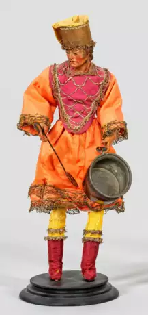 Junger Mann in antikisierender Tracht mit zylindrischer Kappe des 18. Jh., dazu: 2 Küchengeräte. Terrakotta farbig gefasst, Glasaugen, Seidenstoffe mit Brokatstickerei, Metall. Rechteckige Holzplinthe, neuzeitlich. Ges.-H. 34 cm. Minim. Alters- und Gebrauchsspuren.