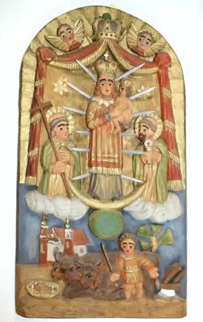 Polnischer Bildhauer. Zwei Wandreliefs mit Biblischen Szenen. Rückseitig bez. u. sign. 73 x 40 cm. u. 66 x 37 cm. Flügel des Drachen angebrochen u. best.