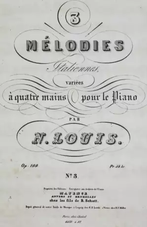 Dabei: Beethoven. Ouverture clélébre. Hbg., Crantz o.J. 15 S. - Beethoven. Trois Sonates. Brschg., Meyer o.J. Nr. 643. - Angebunden: Ders. Deux Sonatines...Hbg., Crantz o.J. - Ders. Erste Snofnie C dur maj. Offenbach, Andre o.J. Nr. 6121. - Mozart,W.A. Chorstimmen zu Missa pro Definctis. Bonn u.a., Simrock (1824). 11 S. - Louis,N. 2 Melodies... Mainz o.J. Bellini, 10 Pieces Favorites...Mchn., Aibl. o.J. 26 S. - Schumann,R. Symphonie für grosse Orchester...Lpz., Breitkopf und Härtel o.J. Nr. 6683.