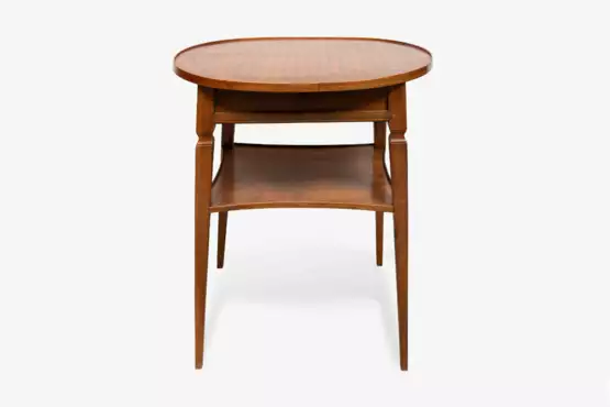 Um 1800. Nussbaumholz. Rechteckige Zarge mit Schublade auf vier schlanken Pfeilerbeinen mit Tablar. Ovale, gefrieste und parkettierte Platte. 70 x 53,5, Höhe 66,5 cm.