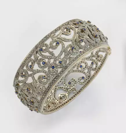 Silber, teilw. mit Roségold verbödet. Leicht bombierter, zweigeteilter Armreif aus umlaufendem Rankenwerk, ausgefasst mit Diamantrosen von zus. ca. 8,00 ct. und Saphiren von zus. ca. 0,60 ct.; D. 6,5 cm. Gew. ca. 64,64 g.