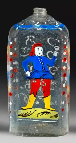 Farbloses Glas mit Emailmalerei. Vorne ein junger Bursche, der sein Glas erhebt, rückseitig Text: "...mein Schatz 1756". An den Schmalseiten bunte Blattzweige. H. 13 cm.