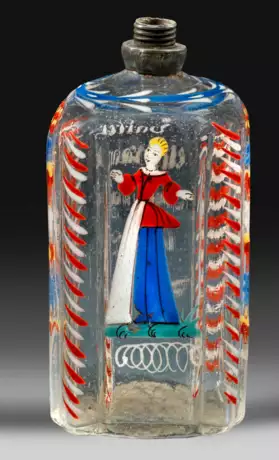 A South German or Alpine liquor bottle with enamel decor of a girl and her speech.