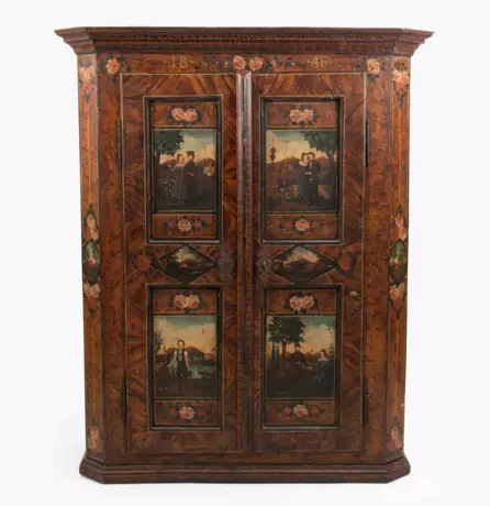 Ostschweiz, datiert 1846. Tannenholz. Rechteckiger, zweitüriger Korpus mit abgeschrägten Ecken. Abgetreppte Sockelleiste und vorkragender Kranz. Maserierte Fassung. Polychrome Blumenmalerei, in den Türfüllungen Landschaften mit figürlichen Darstellungen. Eisenbeschläge. Innen Tablare und Schublade. Einteilig. 125 x 55,5, Höhe 152 cm.