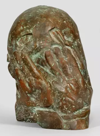 Bronze, in braunen und nuancierten grünen Tönen patiniert, um 1990. Sign.; Abstrakt dargestellter Kopf, die Hände vor das Gesicht haltend. Altenstein studierte 1964 - 1969 Bildhauerei an der Akademie in Stuttgart bei Prof. Rudolf Daudert, 1975 - 2009 lehrte er als Professor an der Hochschule für Künste in Bremen den Studiengang Plastik, seit 1994 hat er sein Atelier in Worpswede. Ab Mitte der 1970er Jahre verantwortete er wichtige Entwicklungen für die Kunst im öffentlichen Raum. Menschliche und figürliche Plastik sind wichtige Sujets in seinem Werk.