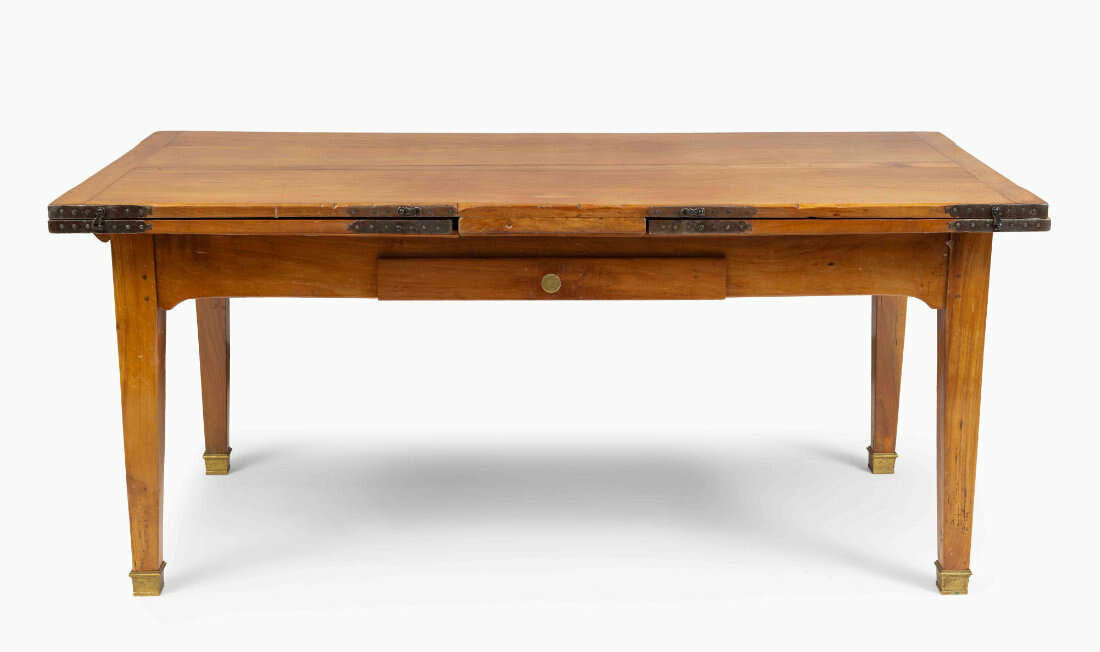 Um 1820. Kirschbaumholz massiv. Rechteckige Zarge mit Scheinschublade auf vier kräftigen Pfeilerbeinen mit Messingsabots. Platte mit zwei seitlichen Auszügen. Eisengeschmiedete Beschläge.175 x 86, Höhe 78 cm, ausgezogen ca. 320 cm.