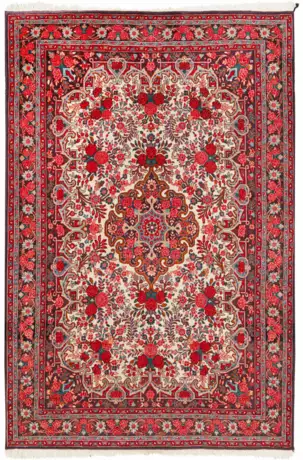 Persien. Wolle auf Baumwolle. Im hellen Innenfeld dunkelgrundiges Zentralmedaillon sowie flächendeckende Musterung aus Rosenblüten. Umlaufend korrespondierende Bordüre, begrenzt von schmalen Bändern. 172 cm x 112 cm.