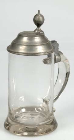 Лот 605 | Biedermeier-Bierkrug, mit Zinnmontur, um 1820, mit Abriß, Zinndeckel mit Besitzermonogramm und Kugeldaumendrücker, Ges.-H. 22 cm