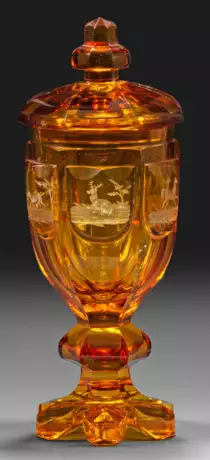 Farbloses Glas, silbergelb gebeizt, geschliffen und geschnitten. Auf sechspassig ausgeschliffenem Fuß facettierter Schaft mit kräftigem Nodus. Schälschliffkuppa mit sechs Hochschliffmedaillons, auf fünf davon geschnittene Tierdarstellungen aus dem Umfeld der Jagd, ein Medaillon freigelassen. Achtfach geschälter Deckel möglicherweise sekundär. H. 22,8 cm.