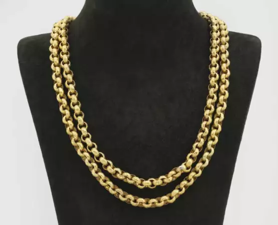 Gelbgold, 18 k. Profilierte, satinierte Erbsenglieder mit Freundschaftsschließe. L. ca. 120 cm. Gew. ca. 44,54 g.
