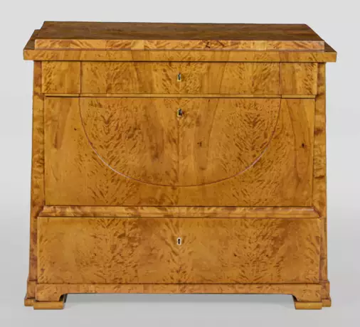 Birkenholz, furniert. Gerader, konisch verlaufender Korpus auf gekantetem Zargensockel. In der gegliederten Front drei, teilw. vorkragende Schubladen unterschiedlicher Größe. Gestuft ansteigende Deckplatte. 83 cm. 95 cm x 52 cm.