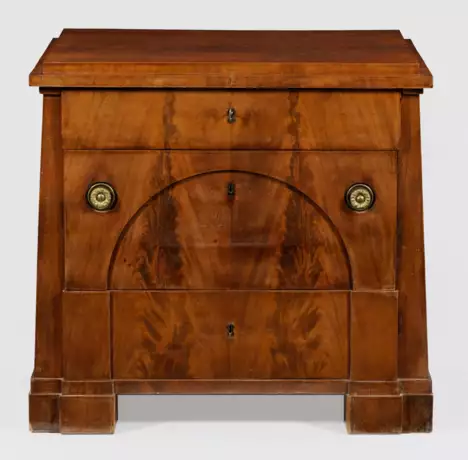 Mahagoni, furniert. Gerader, konisch verlaufender Korpus auf gekanteten Füßen. In der gegliederten Front drei Schubladen unterschiedlicher Größe, teilw. durch eingezogenen Segmentbogen verbunden. Gering überstehende, gestuft ansteigende Deckplatte. H. 89 cm. 94 cm x 52,5 cm.