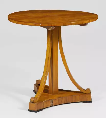 Kirschbaum, furniert. Über dreiseitig konkav eingezogener Sockelplatte gekanteter Schaft, flankiert von gebogten Streben als Träger für klappbare, runde Deckplatte. H. 77 cm. D. 78 cm.