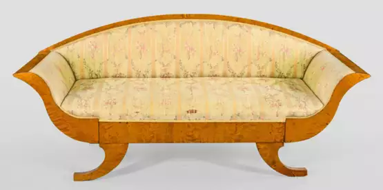 A Baltic birchwood veneered Biedermeier sofa. Signs of use.